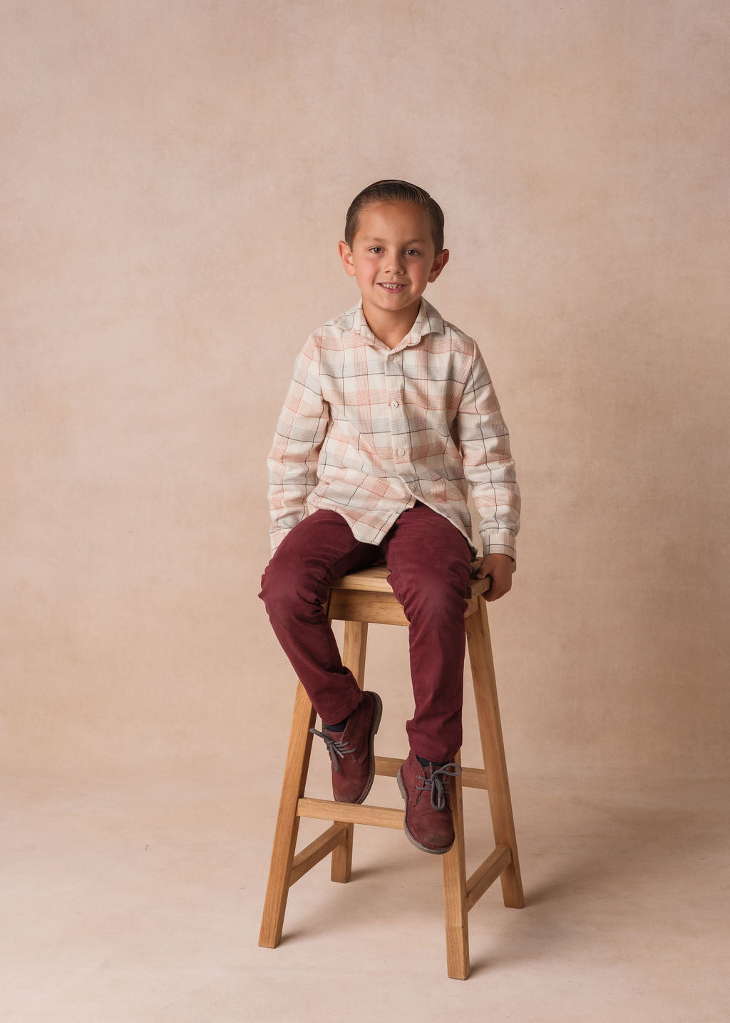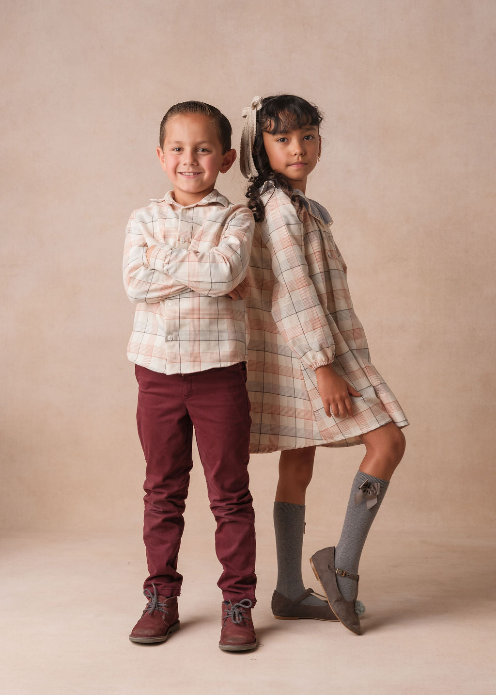 Camisa de cuadros con fondo crudo y lineas grises, azules y rosas.