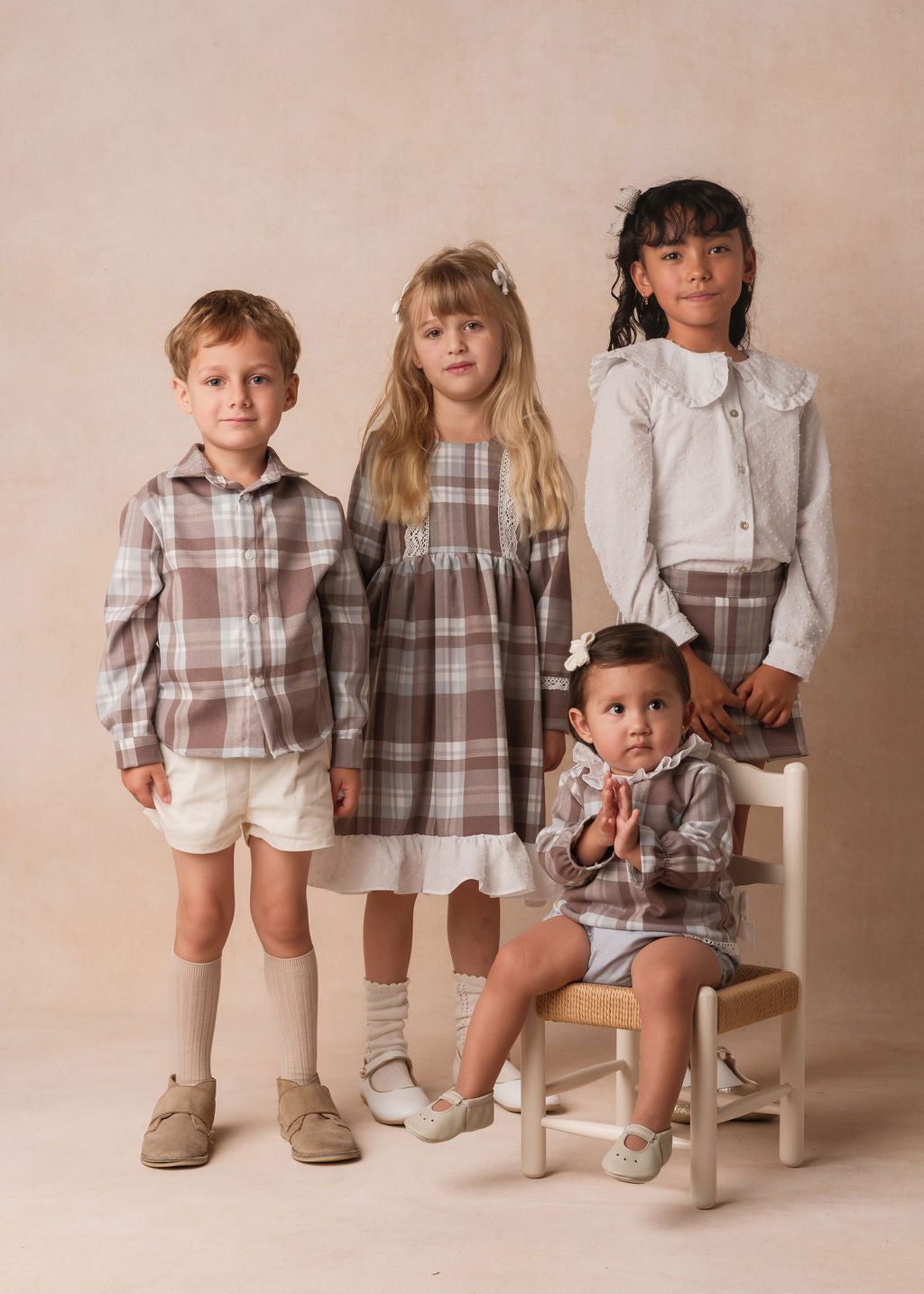 Camisa de viyela dd algodón tipo tartán de colores azul cielo, café y blanco. Forro 100% algodón.