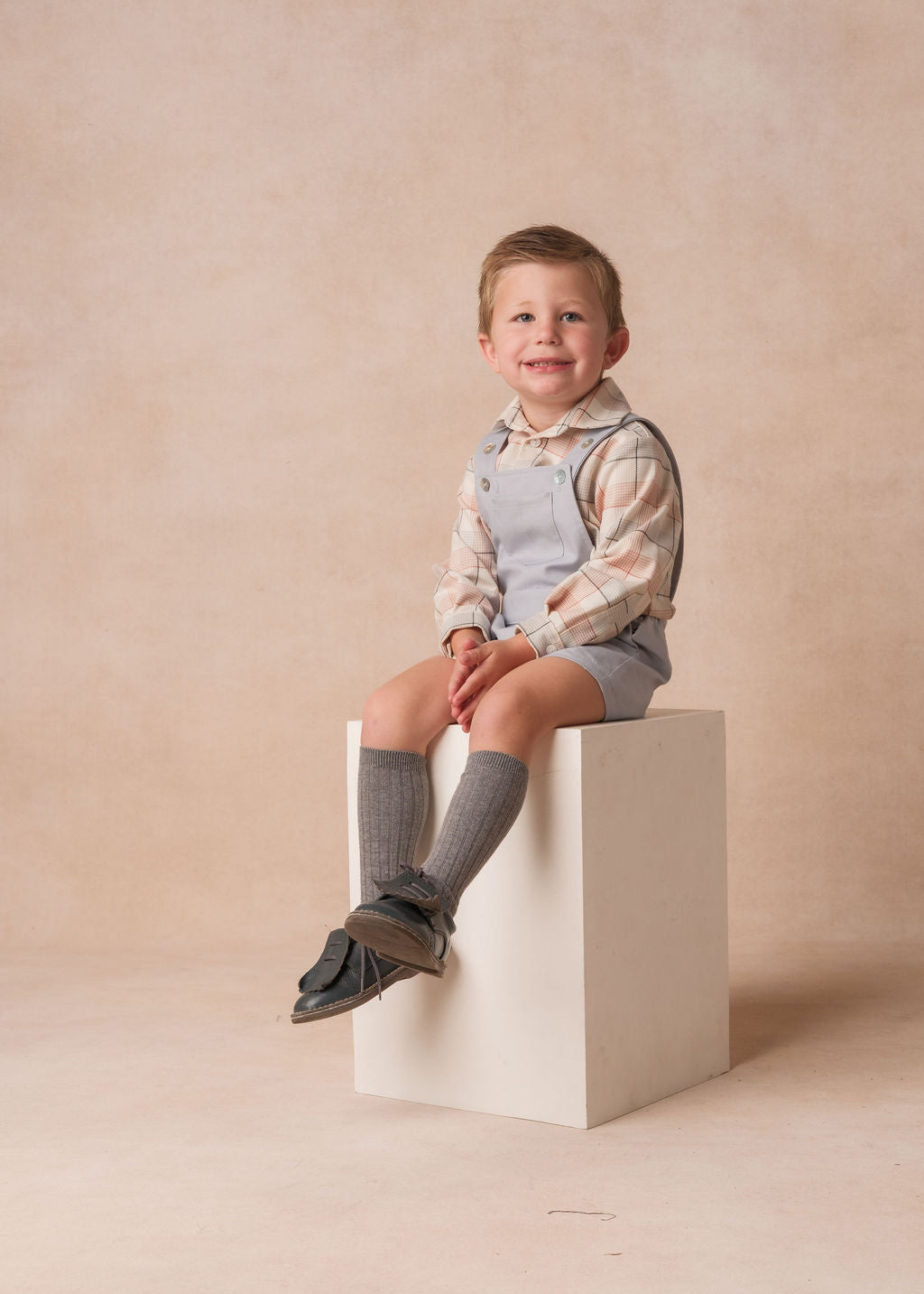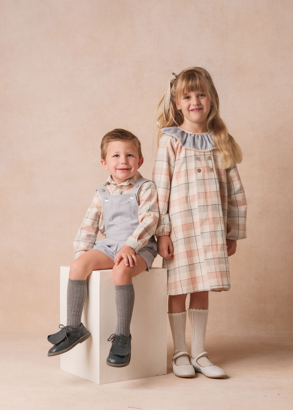 Conjunto de camisa de cuadros con fondo crudo y lineas grises, azules y rosas, y peto de viyela color azul cielo. Forro 100% algodón.