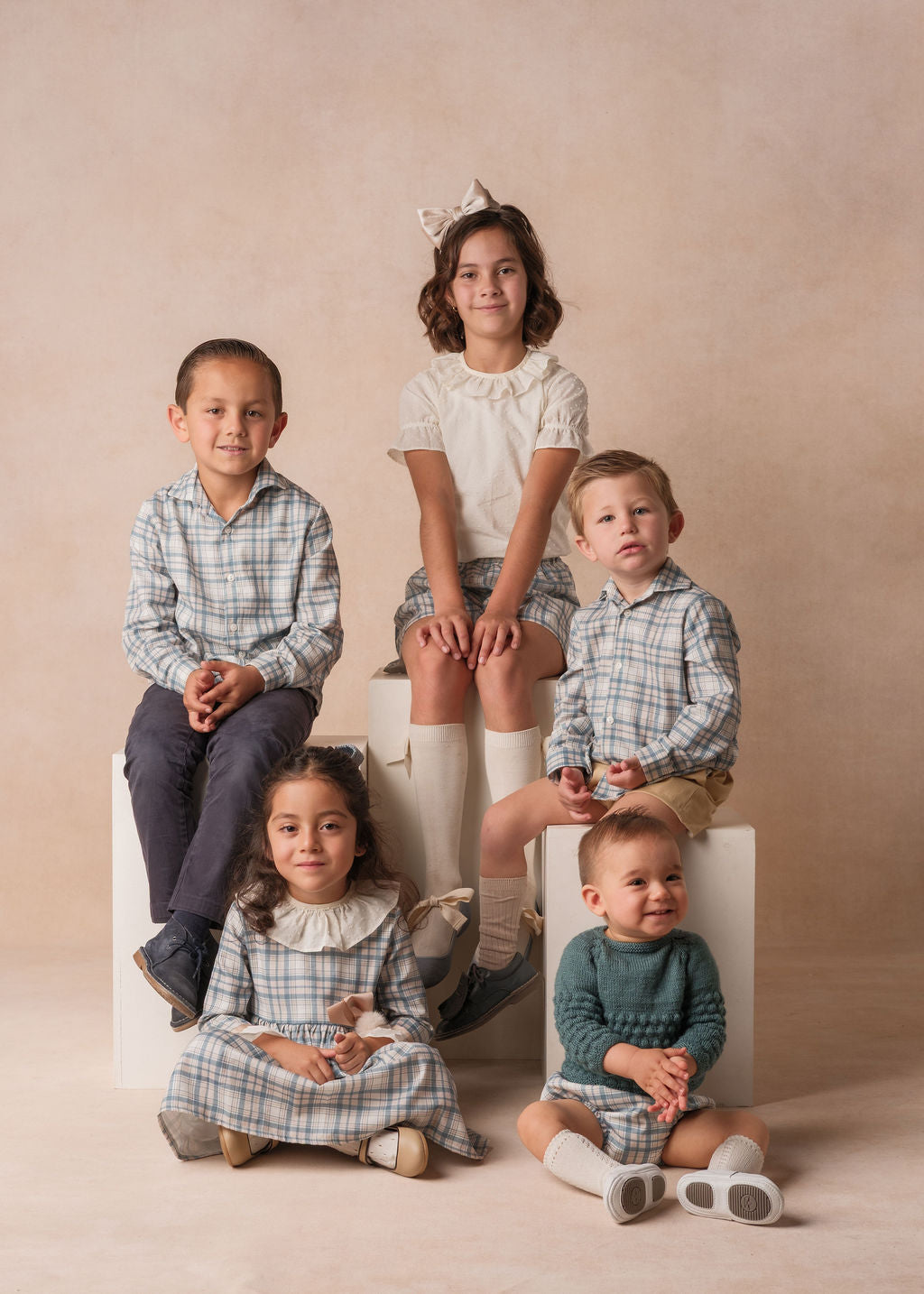 Conjunto de suéter tejido a mano en acrílico y lana merino color petróleo, combinado con cubrepañal de viyela de algodón en tonos crudo, beige y azul petróleo. Forro 100% algodón.
