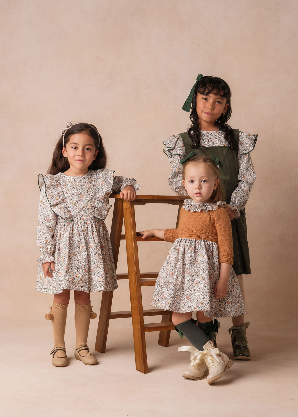 Conjunto de blusa de popelín de algodón con estampado de flores colores verde y camel, y jumper de pana color verde. Forro 100% algodón.