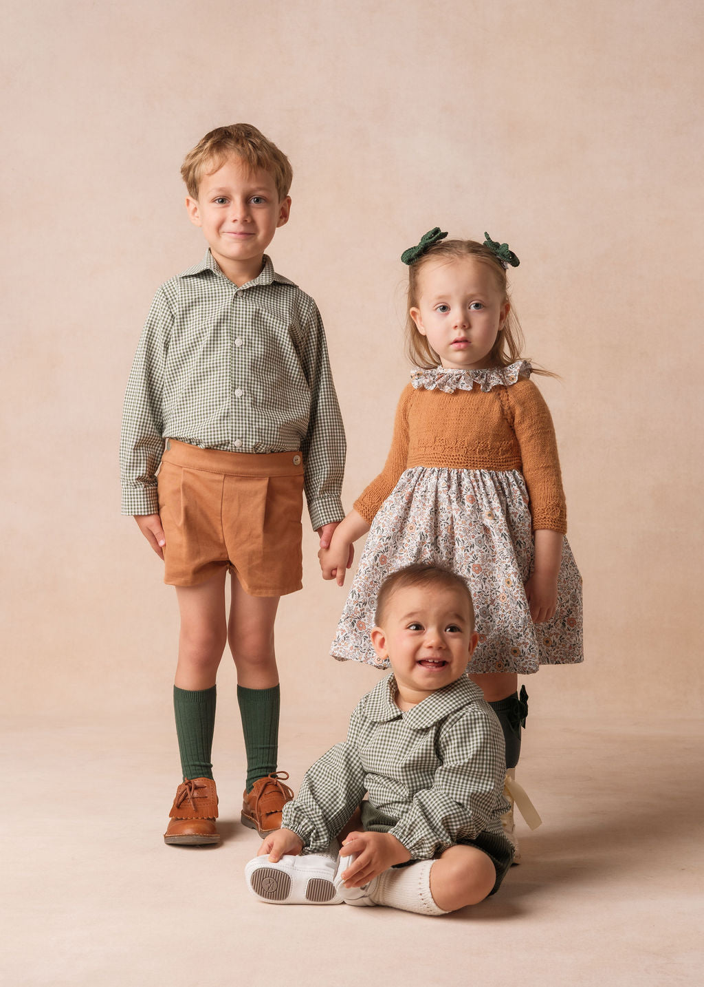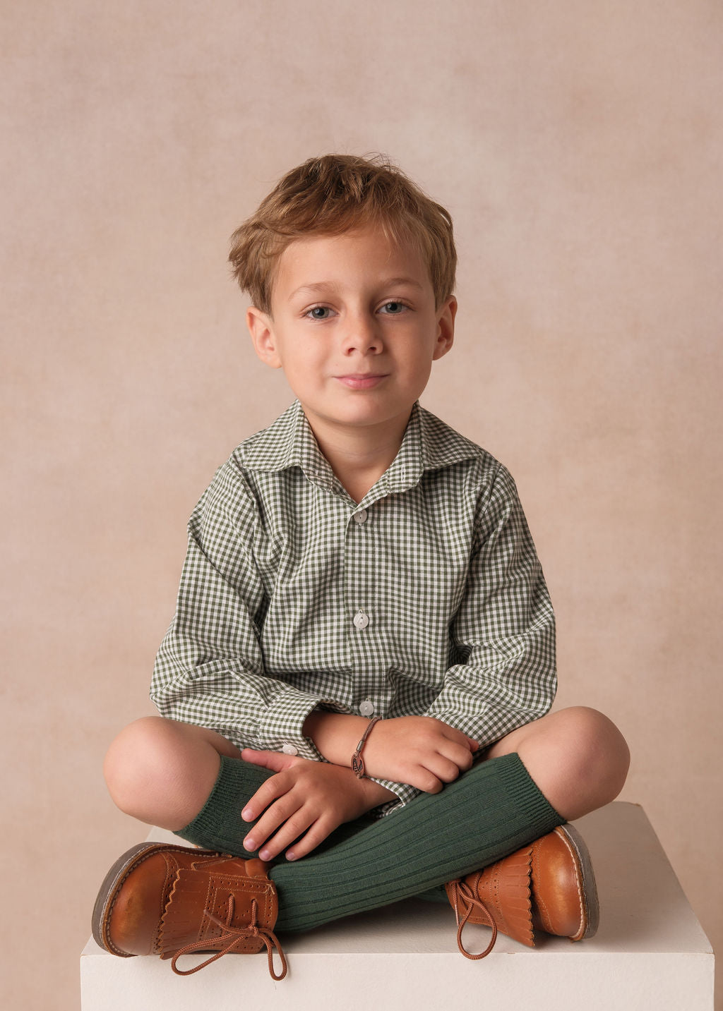 Conjunto de camisa de cuadros vichy color verde y blanco y short de viyela color camel. Forro 100% algodón.