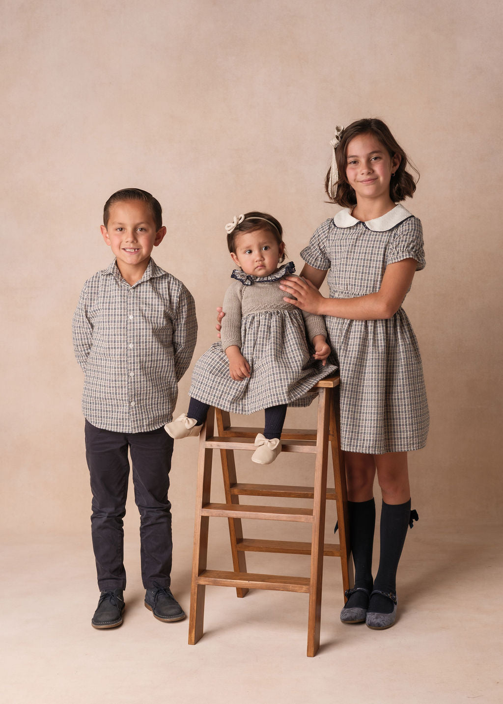 Vestido de manga corta o larga en tela de algodón de tonos topo y azul. Forro 100% algodón.