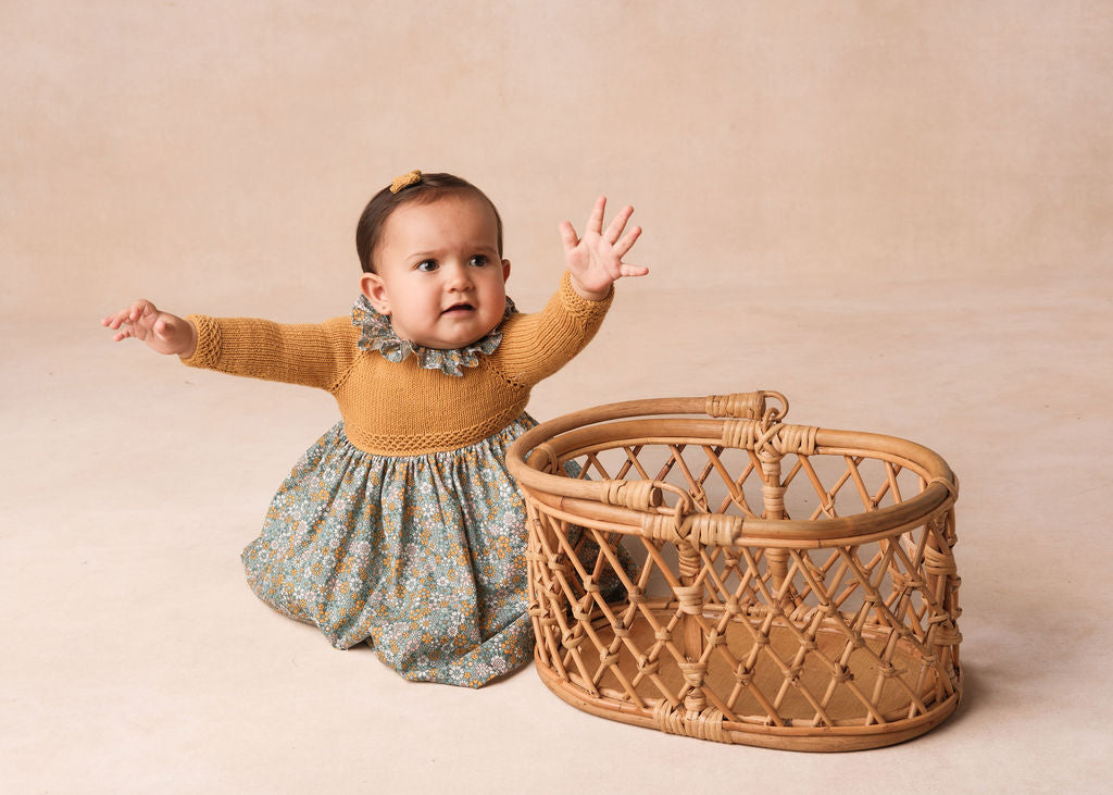 Vestido tejido a mano en algodón color mostaza, combinado con popelin de algodón floreado en colores verde, blanco y mostaza. Forro 100% algodón.