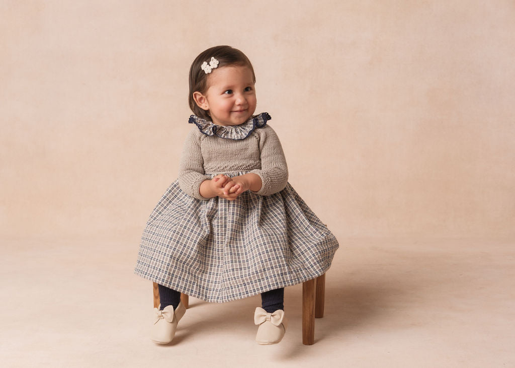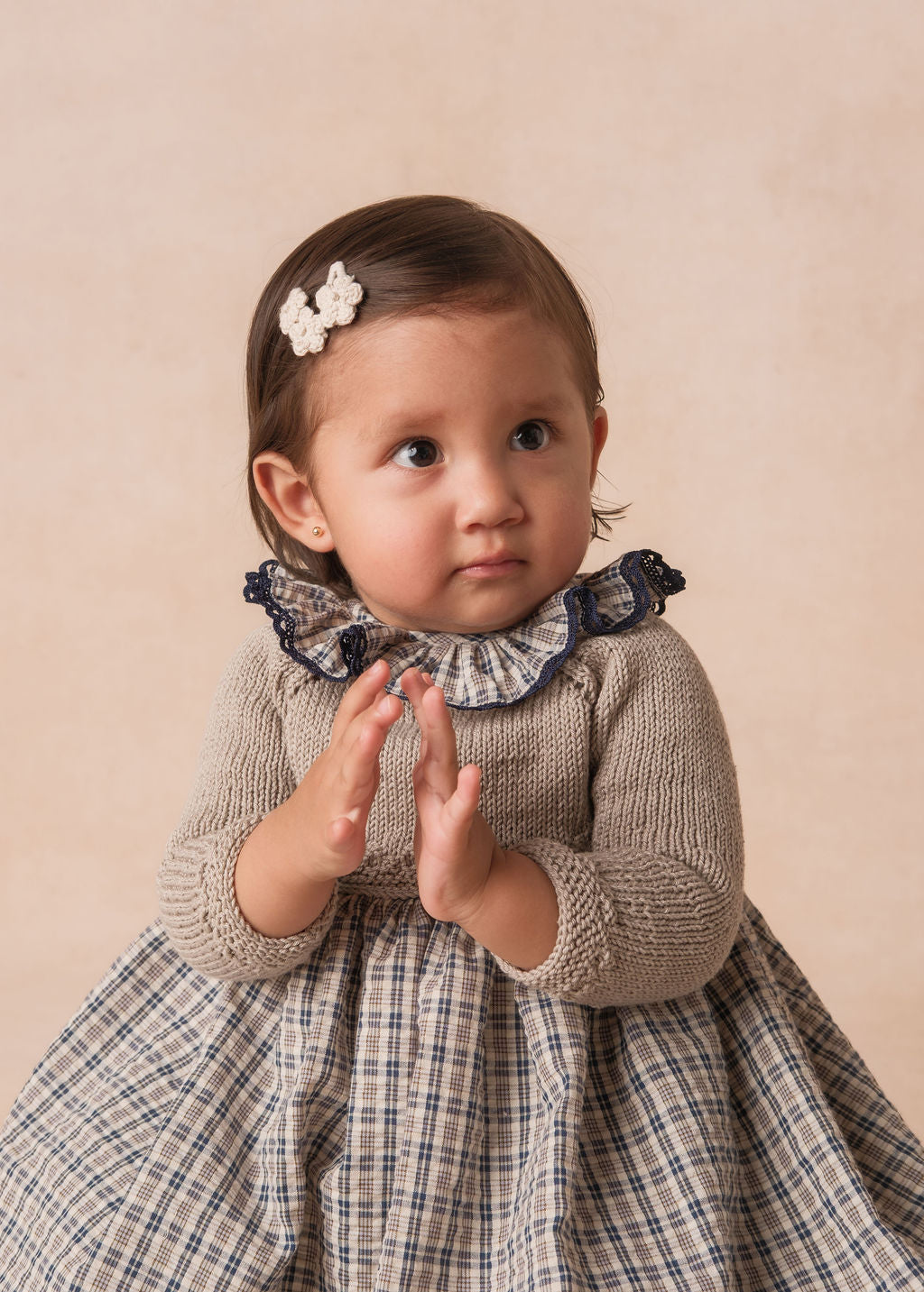 Vestido tejido a mano en algodón color topo, combinado con tela de algodón de cuados color topo y azul. Forro 100% algodón.