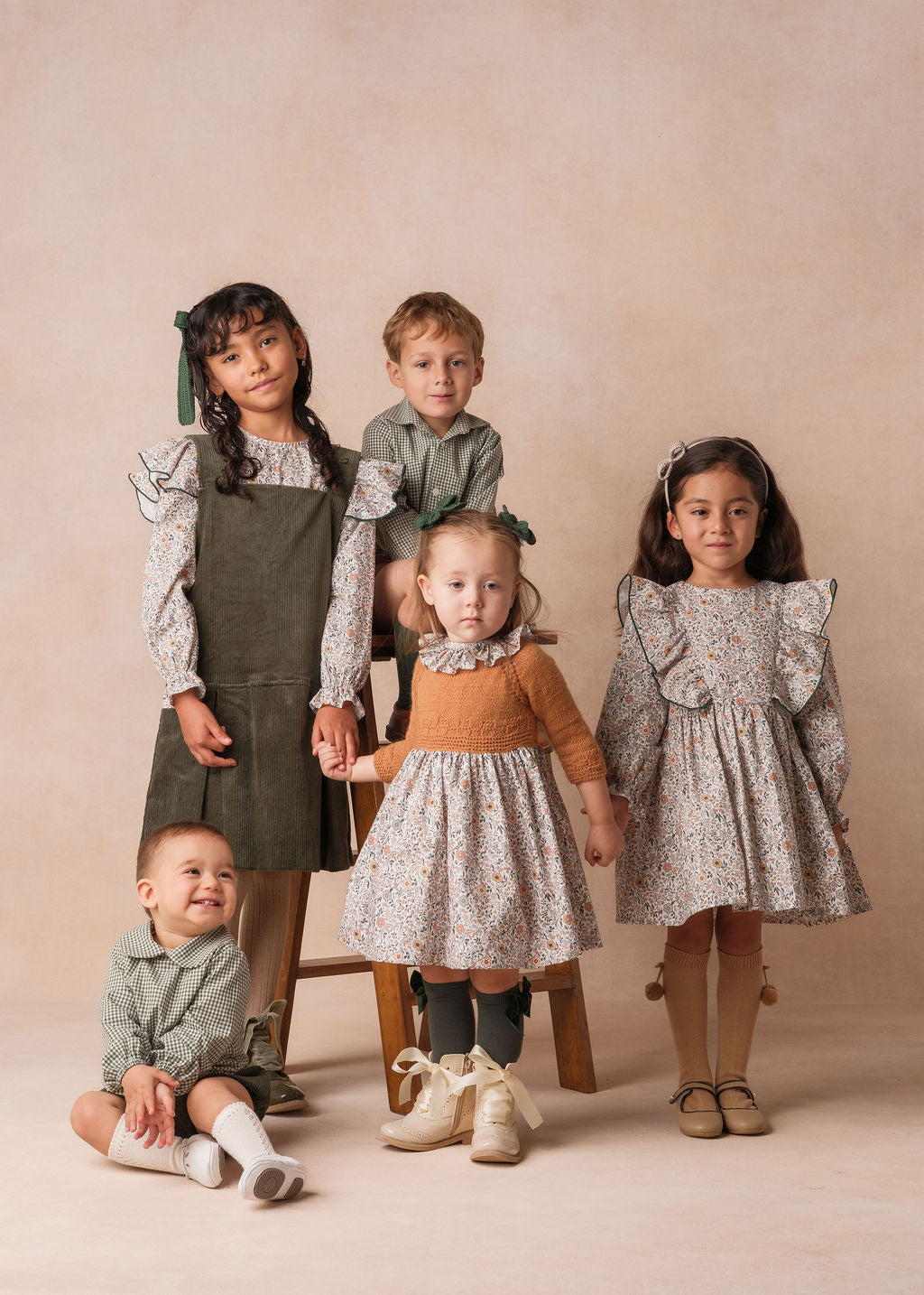 Vestido tejido a mano en acrílico color camel, combinado con popelina de algodón de fondo blanco y flores en colores camel y verde. Forro 100% algodón.
